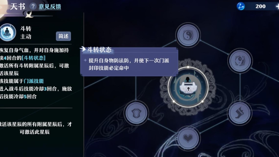 2、斗转:当前回合起抗性加血,四回合内必中封,pvp就不说了,长生的防点杀能力就摆这了,让我看看哪个鬼王想出手,吃药和特技对抗这个情况不谈,必中封必定不可解啊,等测试。
