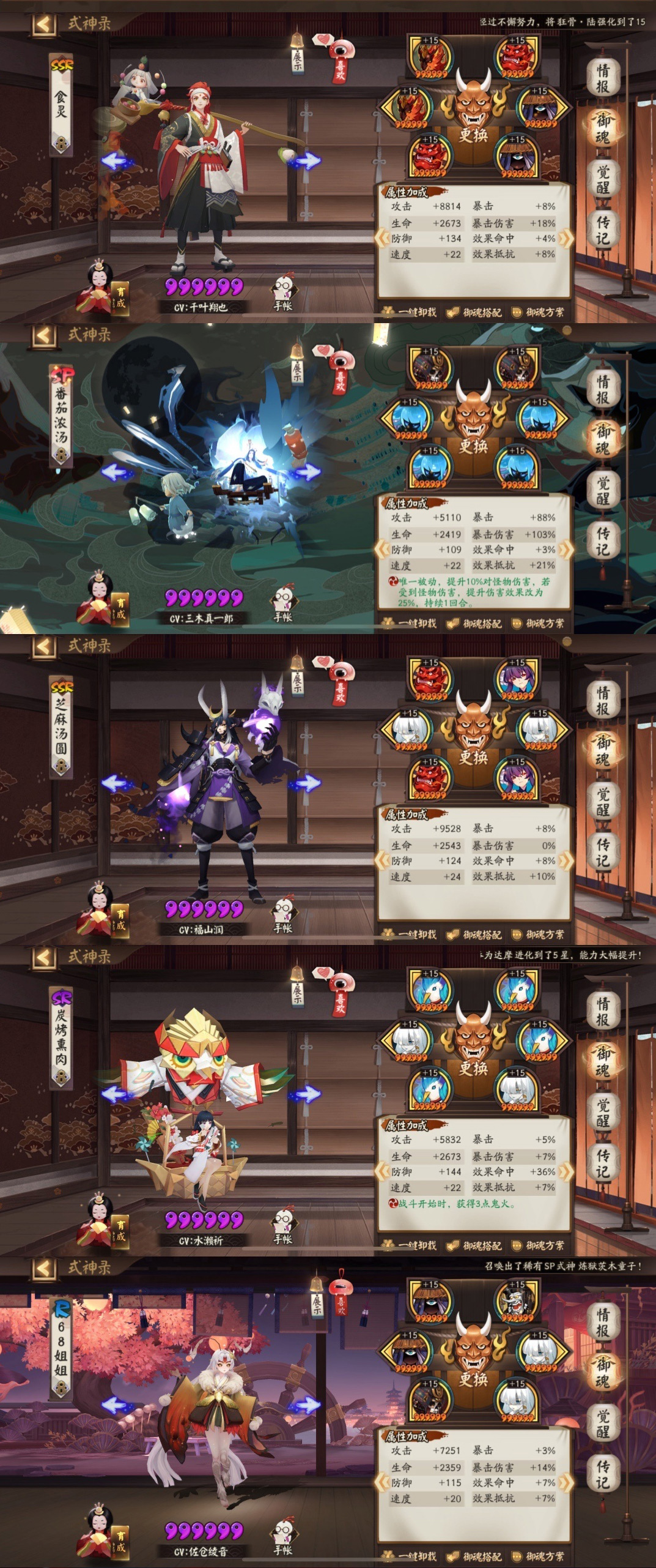 PS:三个高攻工具人可以选普攻动画快的节约时间,例如我选择的薰、茨木、虫师等,但选择的式神要六星不然给到舅妈的攻击力太低;有食灵二号机没升2技能的可以换二号机,防止协战,节约时间。