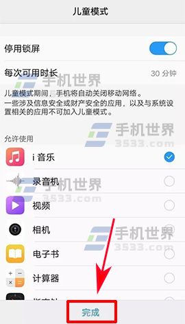 2)进入儿童模式设置界面就可以对使用时长,可使用的应用,都进行自定义设置,可以有效地避免小孩成瘾,接触到有害信息,根据需求设置完毕后点击下方的【完成】即可。(如下图)