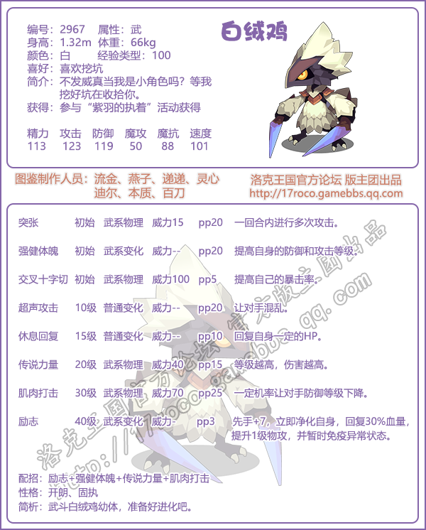 白绒鸡是武斗白绒鸡的幼体,都是收藏宠物,如果想培养的话,那么性格和配招推荐如下: