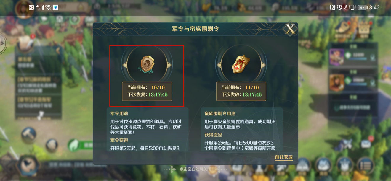 3、以上就是文明与征服军令的获取方式。游戏中讨伐资源点需要消耗军令,如果你想冲击排名,那前期的投资是必不可少的,可以适当充值并购置一些军令,因为矿点的资源量还是非常大的。
