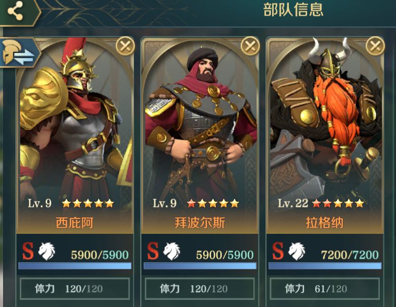 技能推荐:西庇阿带怒吼猛攻和斩首战术/澄明如镜,拜波尔斯带野蛮战吼和钢刃突击,拉格纳带先锋突进和三面出击。