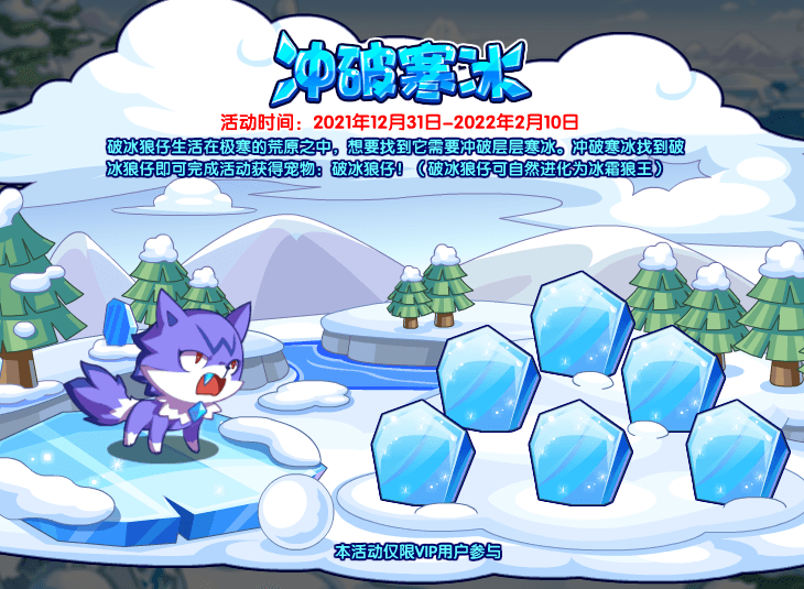 破冰狼仔生活在极寒的荒原之中,想要找到它需要冲破层层寒冰。冲破寒冰找到破冰狼仔即可完成活动即可获得宠物:破冰狼仔!(破冰狼仔可自然进化为冰霜狼王,本活动仅限VIP用户参与)
