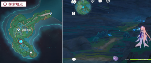 图示探索地点,抬头往上看,山洞顶部的残垣有一只仙灵可以引导。