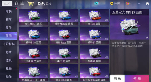 2、车手们仅需打开仓库,来到“蓝图”或“零件”页面,选择多余的蓝图及零件资源,点击回收即可获取相对应品质的蓝图碎片或零件碎片。但需要注意的是,车辆需要达到8级以上,才可以进行蓝图回收或零件回收操作!