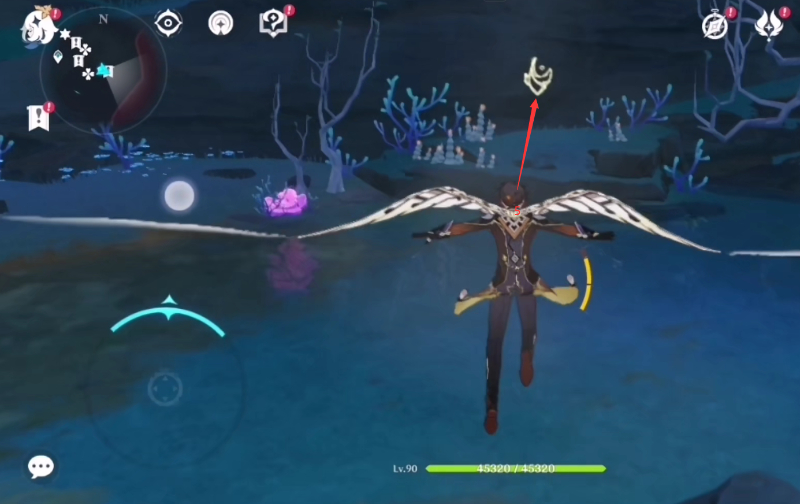 第五个点位需要飞到洞口的下面位置,穿过洞口之后就可以看到在墙上贴着的第五个光印记图标。