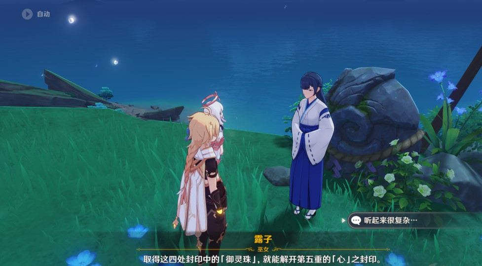 得到4颗【御灵珠】之后,我们需要前往珊瑚宫传送锚点处找到巫女【露子】。她会要求我们一起前往【心】所在的地方。(入口在悬崖中间的一处隘口)。
