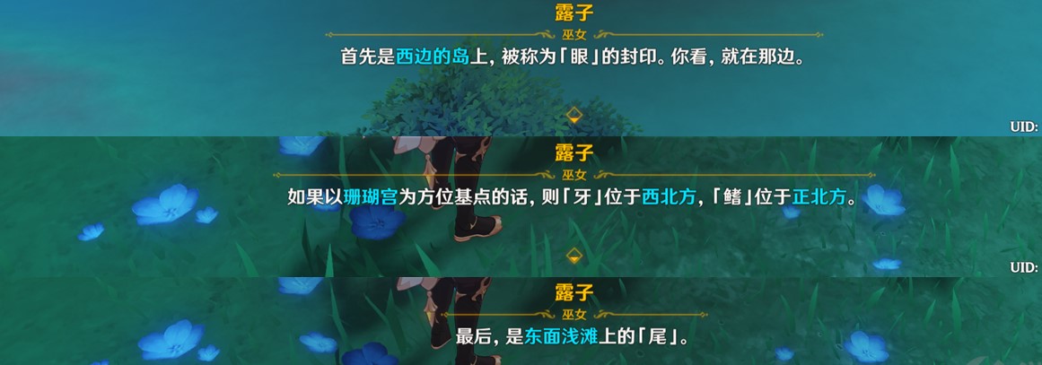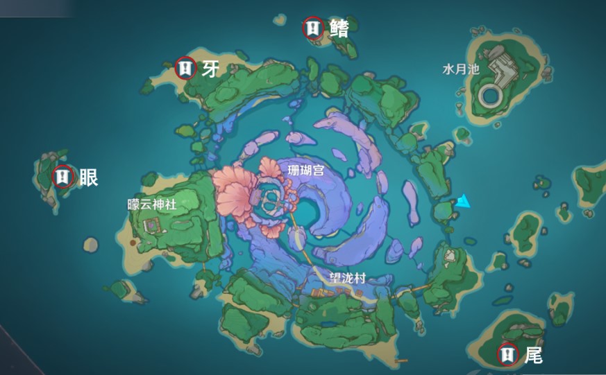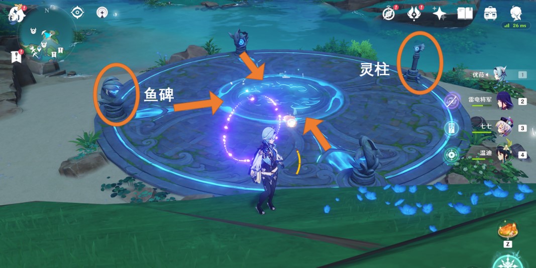 这里是一套简单解谜,任务要求是【所有鱼碑的头部对准圆盘中心】。解谜有两个特性①:如果没有锁定,两个石阵的鱼碑是会一同转动的。②:可以祭拜石阵上的灵柱锁定该石阵,之后该石阵上方的鱼碑将不会再转动。