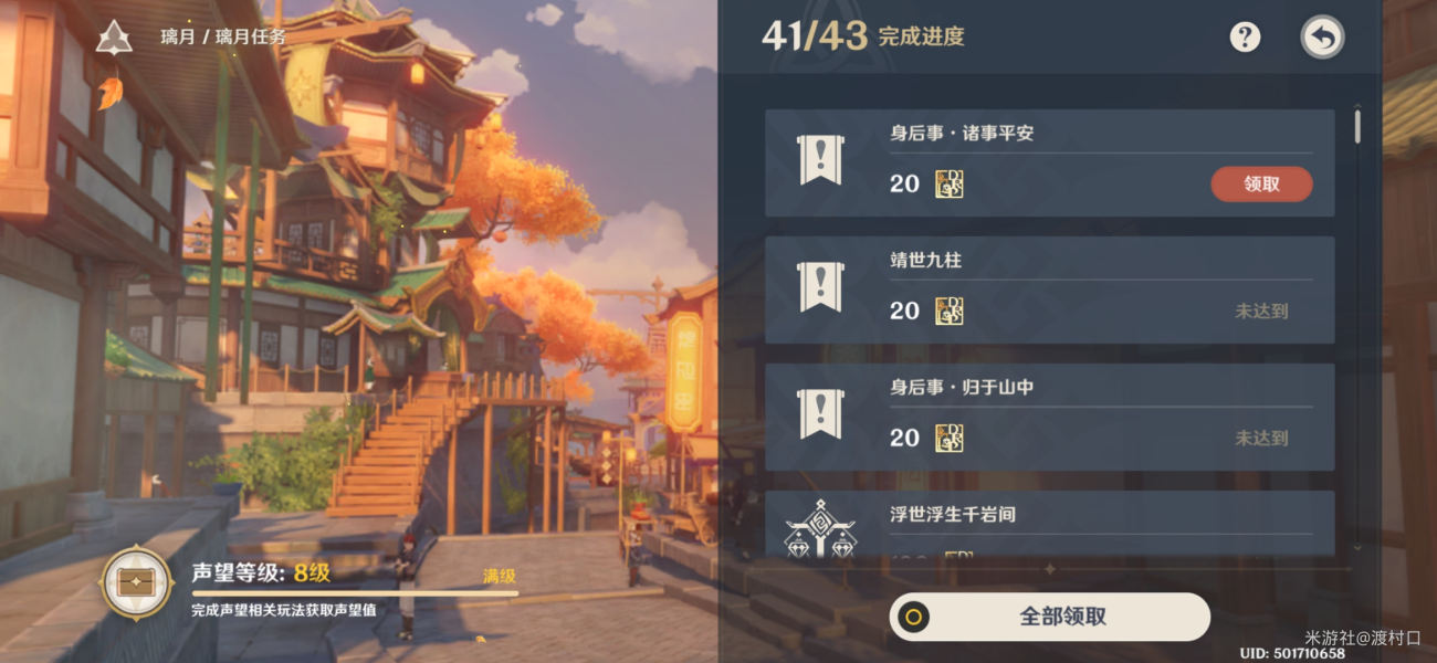 3.送完却砂木后,任务完成,可领取璃月声望奖励。