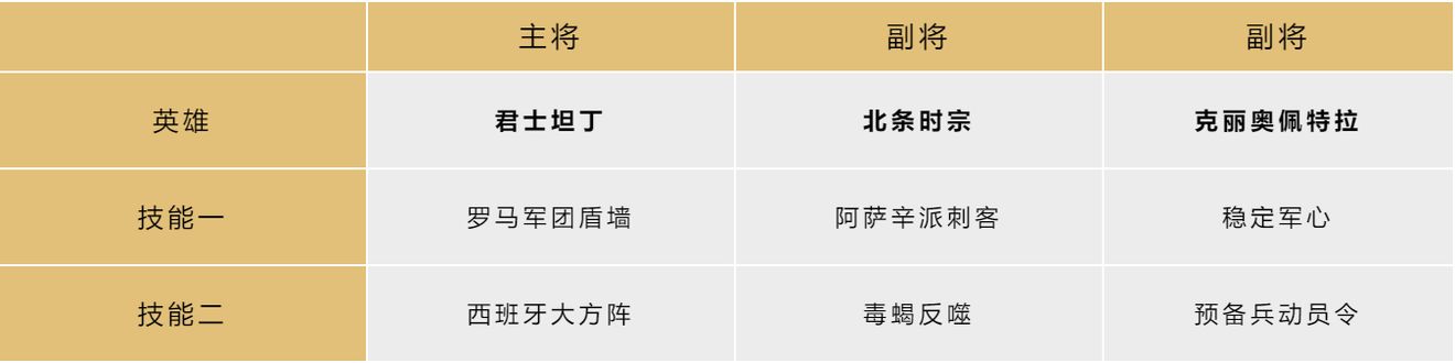 搭配主要适用于没有汉尼拔的时候,可以用北条时宗代替,但是在技能搭配上又比汉尼拔的容错率高,既可搭配主动打爆发,也可以搭配被动,指挥类的伤害技能稳定输出。