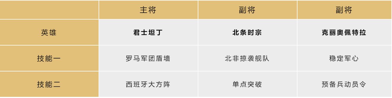 君坦搭配的技能主要就是嘲讽敌方武将(瑞士卫队可以替换,但容易被沉默,而罗马军盾是被动技能不会被沉默)并降低伤害。