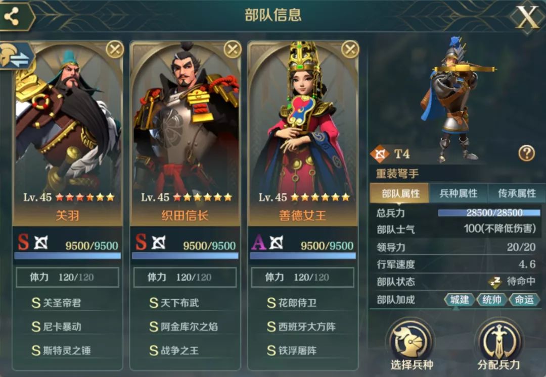 2.西班牙大方阵则是配合善德女王的自带技能提供减伤效果,善德女王主要就是带个半月型骑兵阵为主将提供连击和迅捷效果,长生军剑舞提供连击和免疫控制一次。相比纯突队,在敌方搭配了朦胧钟摆的情况下,搭配善德女王的话就是免疫掉朦胧钟摆的缴械,而不是纯突队。
