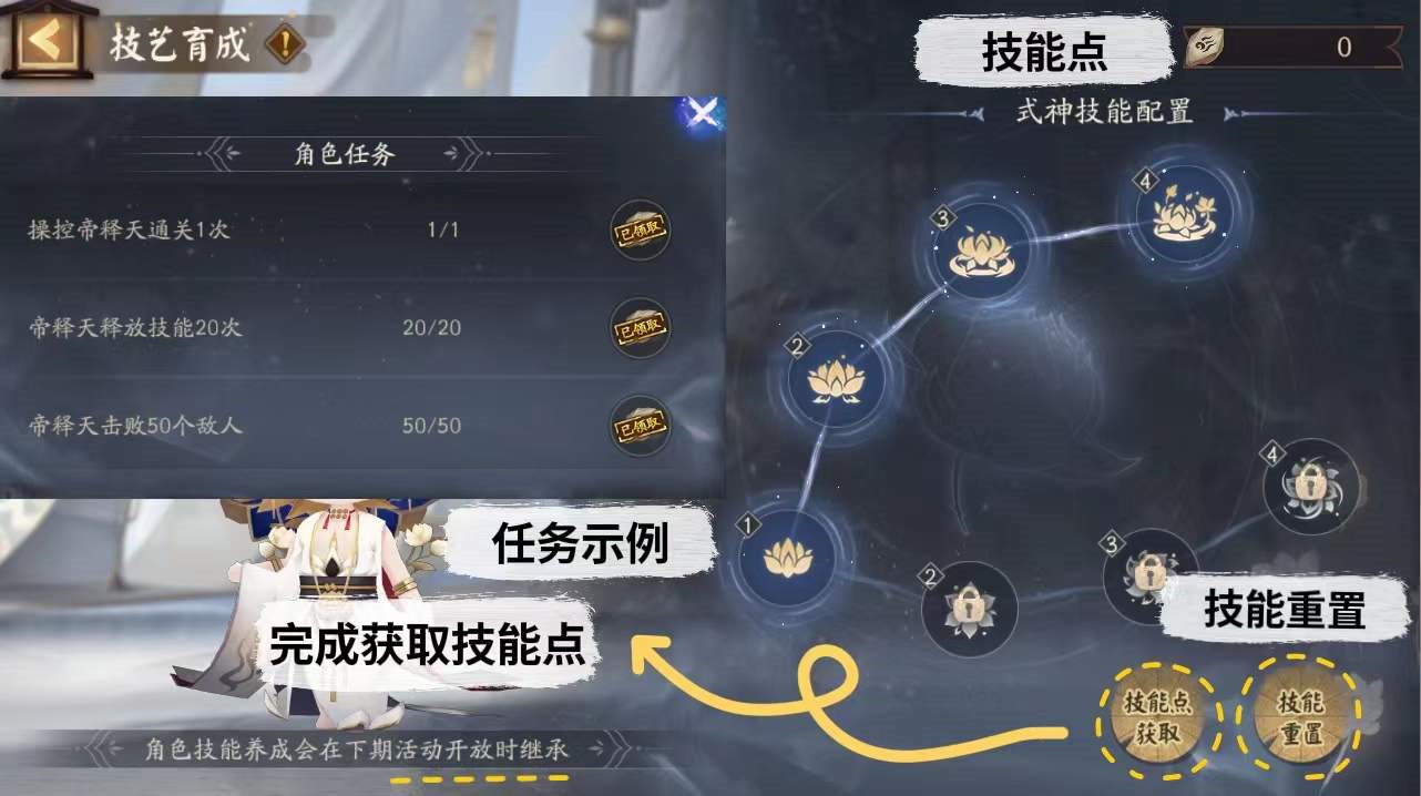 3. 技能点可随时重置,并且会继承到下期活动。如果购买了鬼王酒吞童子,下期活动可继续使用。