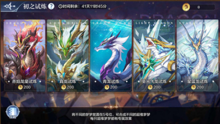全新boss挑战玩法[龙神试炼]来袭!此次挑战分为「初之试炼」、「进之试炼」(*均为boss战,使用自己/系统精灵上阵挑战boss),参与试炼与完成相关任务可获得龙之币,龙之币可在商店中兑换梦之队、梦之队神器装备及梦之队觉醒魂等道具哟~
