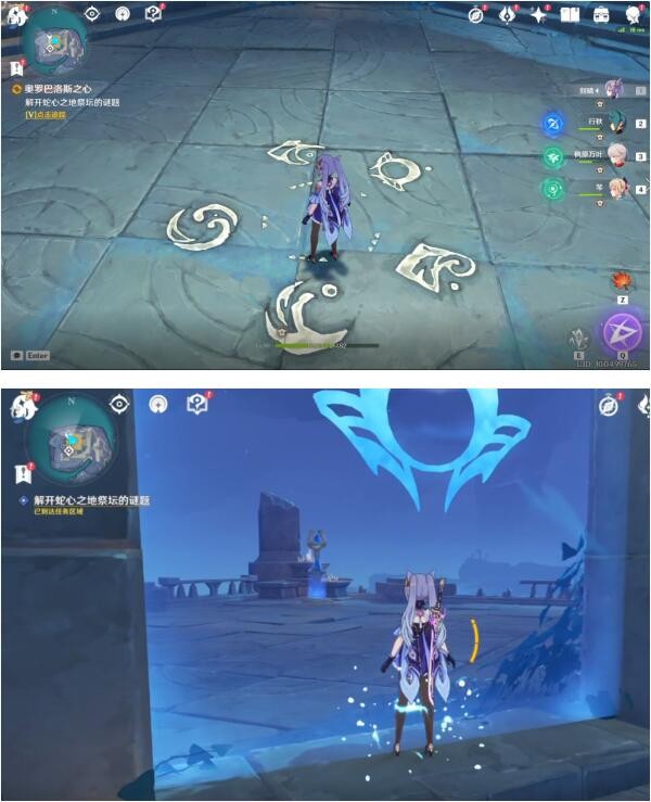 II.启动蛇心之地的祭坛密文,解开蛇心之地祭坛的谜题:将传送点附近的日月**调整至『常夜』状态,观察建筑物中间地上画着的键纹图案和对应的数字顺序,依次触碰建筑物周围印有键纹图案的屏障,随后就会出现一个精致的宝箱,打开后即可获得『苏生之辔』碎片*1