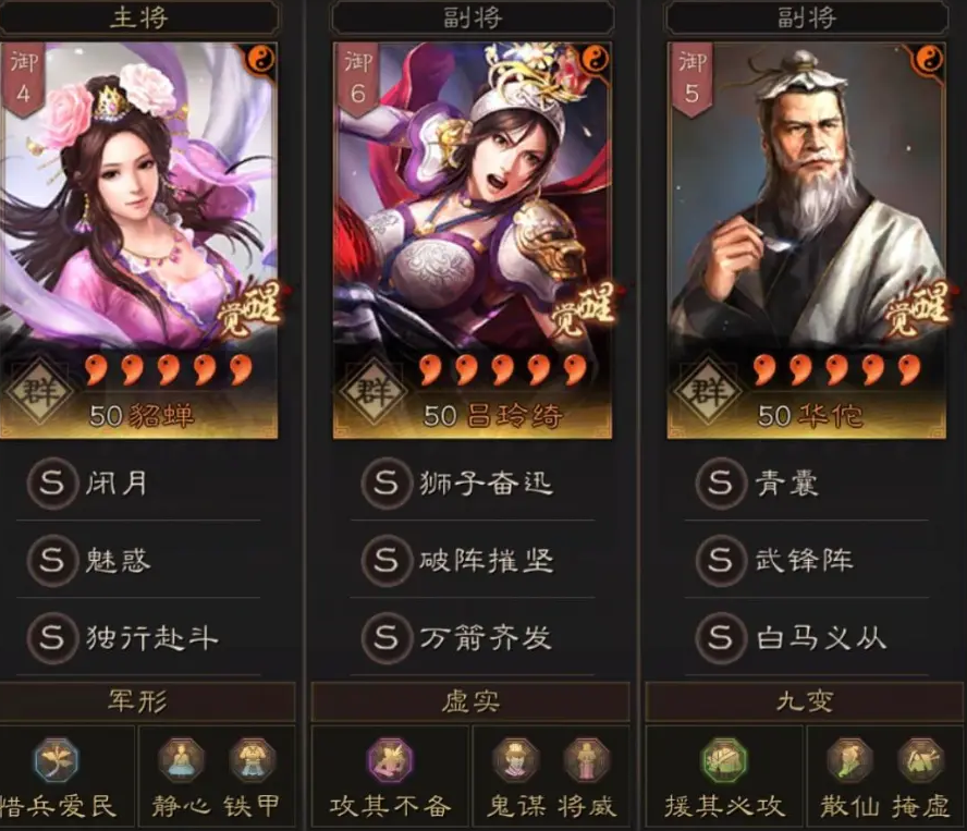 主将 貂蝉:魅惑+独行赴斗;惜兵爱民+静心+铁甲
