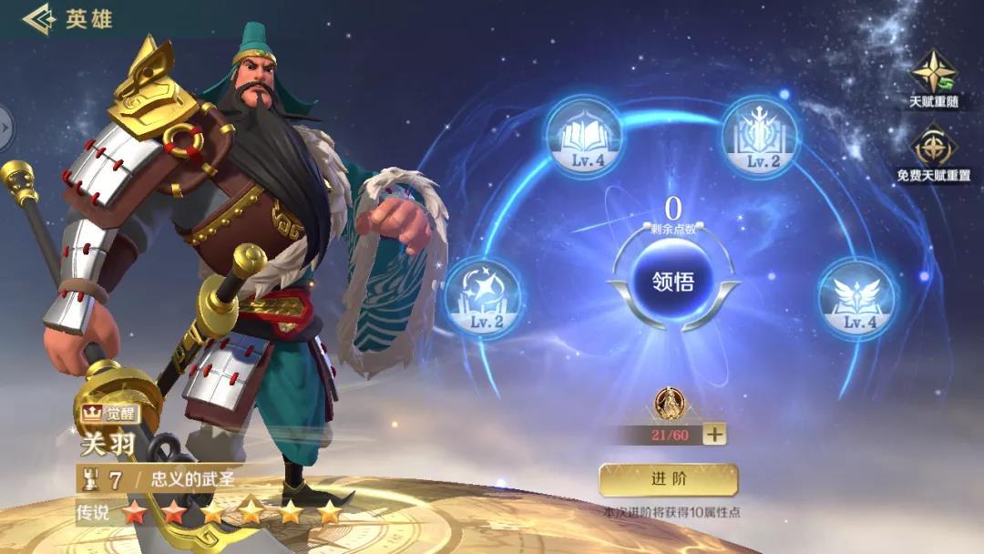 我们在游戏内获得了一定数量的英雄徽章并且满足进阶条件后,可以点击英雄界面的进阶按钮进行英雄的进阶;以关羽为例,天赋界面会出现四个不同的天赋。