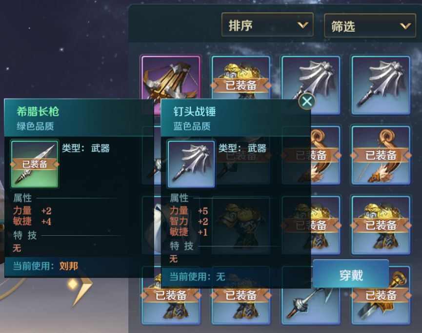 英雄装备跟英雄加点类似,每一点基础属性就相当于是一次加点,所以在选择装备的过程中,我们可以对英雄自身的类型去决定,例:物理伤害型英雄建议佩戴力量属性高的装备。