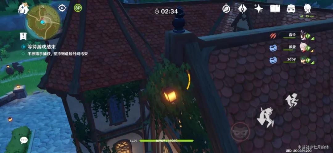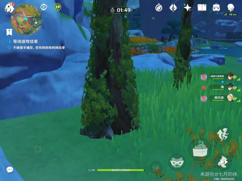 就在离岛的传送点下面,选择小身形的角色,可以完美躲在这个草里,且靠近活动区域的最边缘,被发现的几率较小。缺点是,发现了不容易跑。