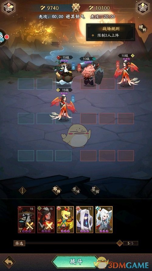 1、避其锐气关卡限制2名角色上阵,推荐玩家上阵熊猫和凤凰这两个角色。