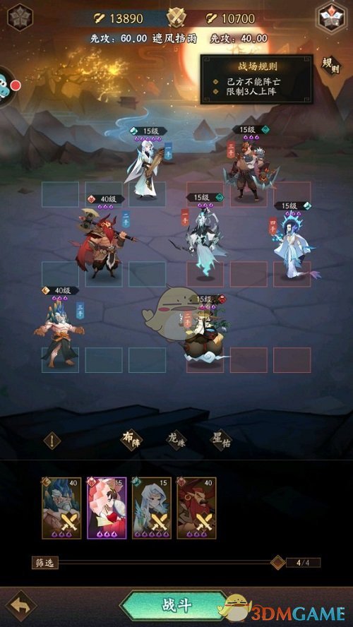 1、遮风挡雨关卡通关需要完成已方不能阵亡,只能上阵3人,推荐夸父、牛魔王、伏羲这三名玩家。