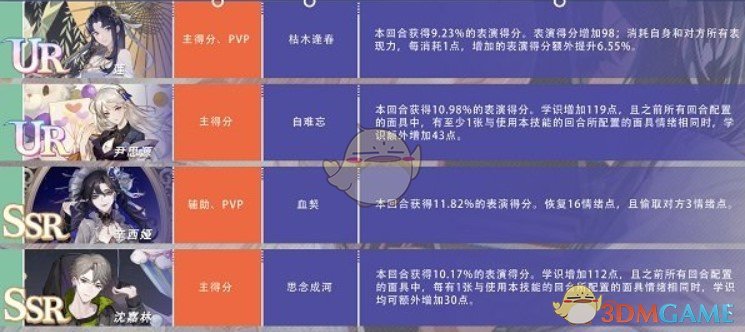 1、主得分类的面具:是游戏中主要的获取分数的手段面具,这类面具对游戏中的作用非常的大,也是游戏中的关键的面具,建议前期先进行一些较为低级的培养,后期根据建议进行高级面具的培养,代表面具:沈嘉林、伊思源。
