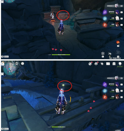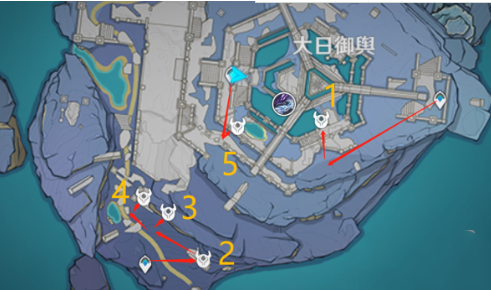 1.标点1:首先切换至常夜,传送至大日御舆右侧传送点,向图中位置飞去,到达后点燃两个火炬后开门,触摸蓝色机关,即可进入标点1。
