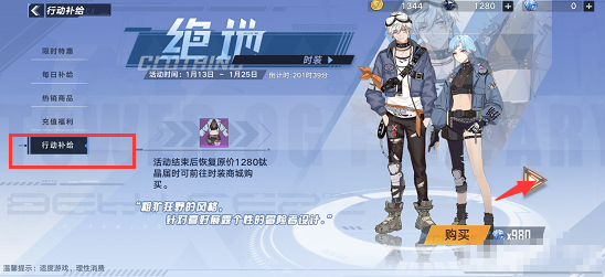 2、点击打开之后,切换到【行动补给】,在这个界面,玩家就可以购买新时装。