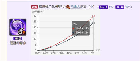 由于曲线未知所以我借用一下gbf的背水曲线给各位看看背水这个词条的恐怖之处,简单概括可以说成是半血达到字面攻刃量,20%血翻倍攻刃,1血三倍攻刃。