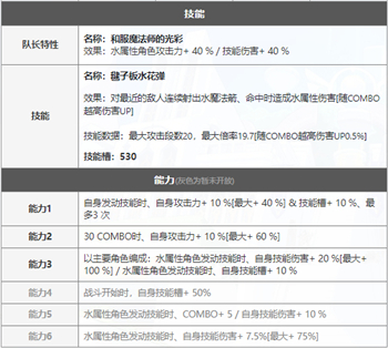 主动技能倍率较低,但有连击增伤补正,数值中规中矩但似乎不太匹配530的条长,但能力1与能力3提供的高额回转可以保证水弹能够频繁地释放技能以保证总伤害量。