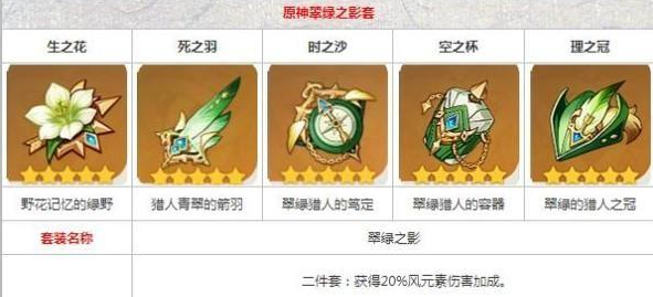 3、到达中推荐后期翠绿之影套,由于砂糖自身为风属性角色,配合翠绿之影的伤害加成以及降低扩散元素抗性的技能,可以大幅的增加全队的输出能力。