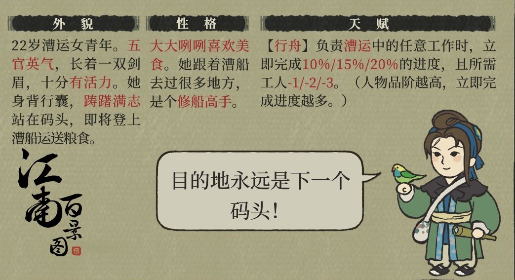 【行舟】负责漕运中的任意工作时,立即完成10%/15%/20%的进度,且所需工人-1/-2/-3。(人物品阶越高,立即完成进度越多。)
