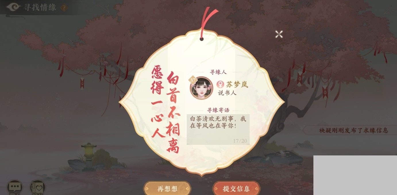 寻缘流程:有固定目标的玩家可以直接邀请,没有结缘目标的玩家可以通过寻缘的方式去寻找情缘,也可通过点击寻缘界面的滚动弹幕查看已经登记的其他玩家,与其进行沟通,达成结缘目标。