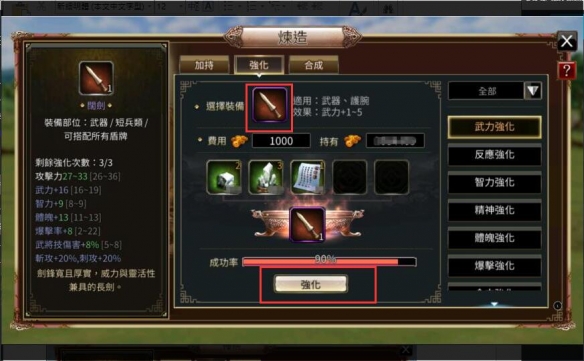 对装备进行强化时,依照强化法的不同,可提升装备的各项属性。