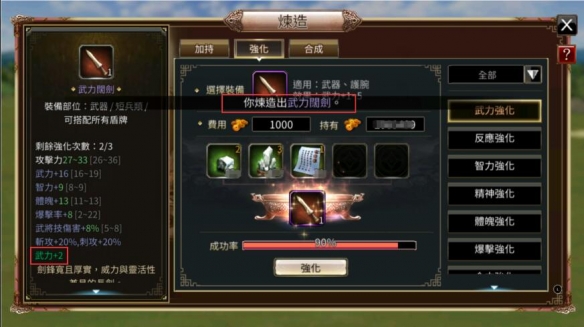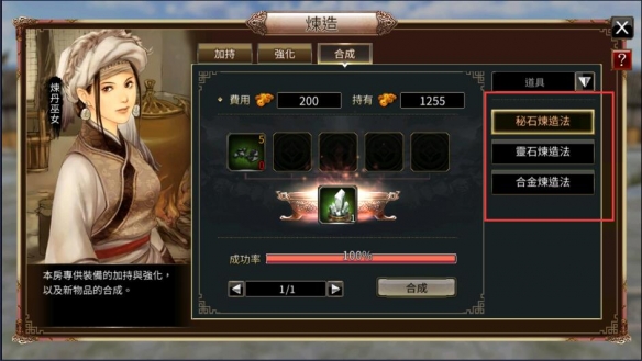 玩家可在选单内的炼造房,对你的装备进行加持与强化,以及新物品的合成