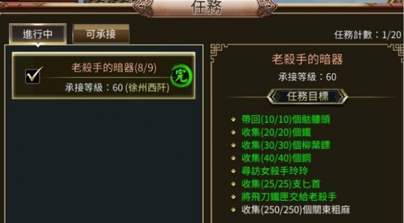 1.徐州西打杀手收集杀手秘帖x1(开任务用)柳叶镖x30匕首x25