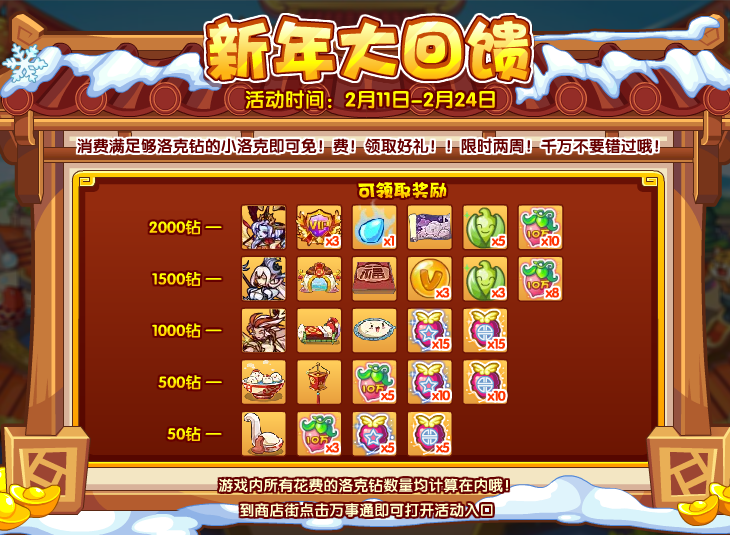 小洛克们在活动期间:2月11日-2月24日期间,累计消耗满足够洛克钻即可领取对应档位的奖励!