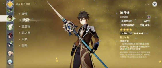 1、该流派在武器的方面的选择有着比较高的要求,由于现阶段能够增加物理伤害的武器只有流月针适合钟离,其余的都不属于本系列武器,所以首推流月针,当然拥有5星类武器更加推荐5星武器,但流月针的整体收益与获取难度都较低,所以更加推荐。