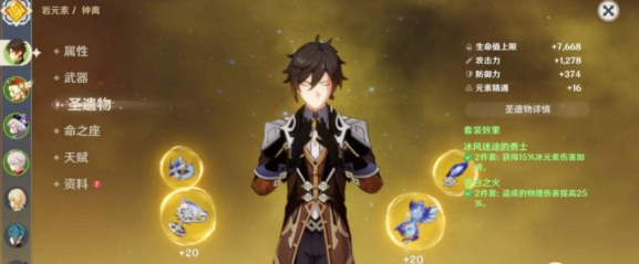 2、在圣遗物的选择方面作为物理流的输出流派,主要选择只有以苍白套和骑士套为主的圣遗物,选择其余的圣遗物都不太适合这个流派的输出,而属性方面主要跟输出型钟离没有太大的区别,主要是更改空之杯的物理伤害选择。