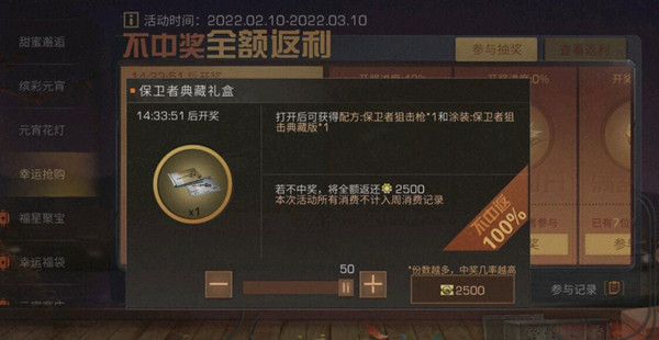 2月10日-3月10日8点,幸运抢购开启,幸存者可消耗幸运金券和幸运银券来抢购顶级大奖和普通奖品,例如涂装:保卫者狙击典藏版等。若未能获奖,幸存者可在指定时段登录并领取相同数量的信用点或联盟支票。