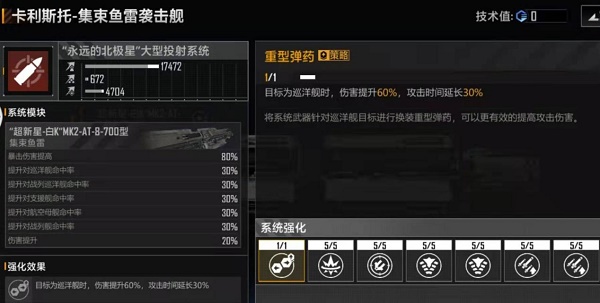 2.鱼雷型:主武器系统中的策略技能属于必点技能,用于大幅提高对敌方巡洋舰的输出;伤害和暴击也是必须点的,用于进一步提高自身伤害;不过值得注意的是,冷却时间应当根据自身的舰队阵容来决定点与不点,如果自身阵容强度不是很高,作战时间集中在1-3分钟,冷却时间完全可以不点,可以加到反拦截或命中率,个人比较推荐命中率。