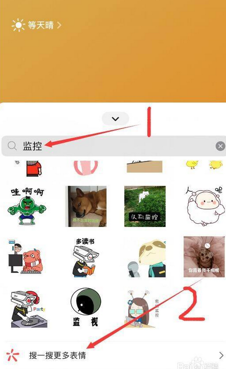 5、进入表情页面点击搜索栏添加监控然后点击更多表情