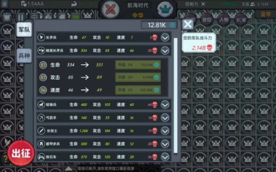 4、累计获得1.5m传承点以上的时候,在战争-兵种里面,把精矛的速度点到36级到46速,即面对任何兵种保持先手,适当点攻击以及传承里面常用物品的生产数量,注意最好留给后面的航海的核心品种一些,我经常忍不住前面点太多后面没传承点了。到了这一步应该整体流程就很熟悉了。