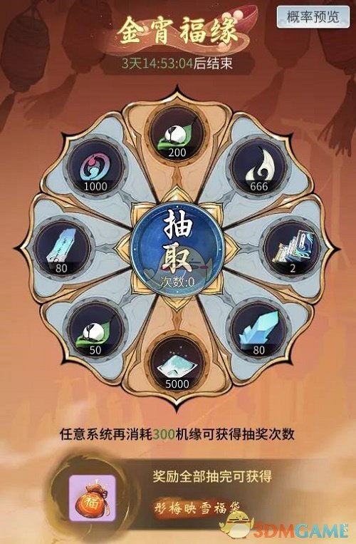 活动期间消耗一定机缘,可获得转盘抽奖次数,总共需消耗5700机缘可抽完所有奖品。