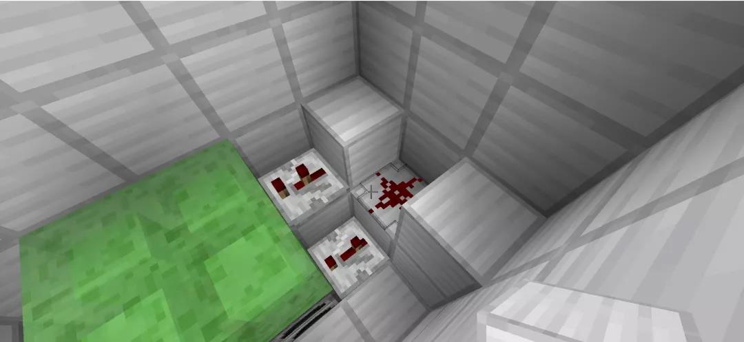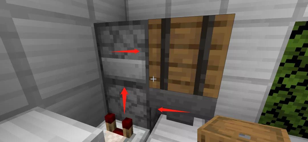 挖开墙壁外侧,放置红石粉,这就是总开关了,可以用任何方式激活它,但要注意保持红石粉能够同时激活两个投掷器。具体还要看小伙伴们自己的布置,布置完成后将其他地方的方块填上即可。
