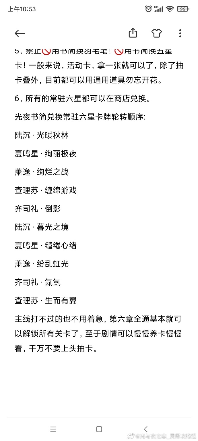 光夜书简兑换常驻六星卡牌轮转顺序: