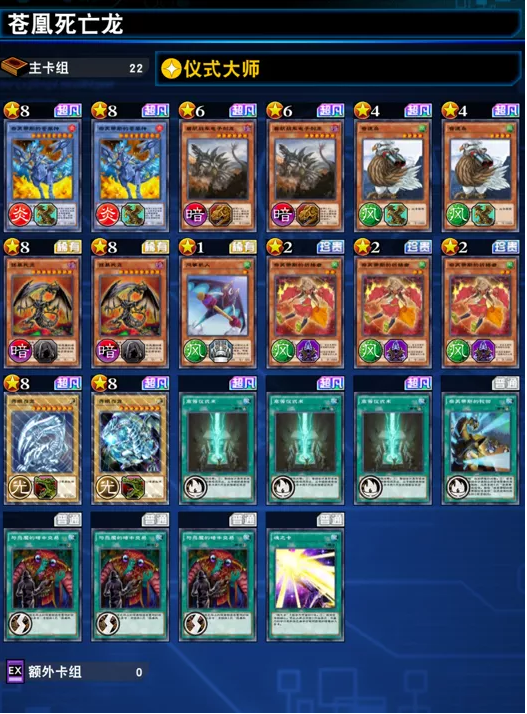 由于苍凰神极其消耗手牌,所以我个人倾向用高仪系统,同时带适当的鸟来配合增加手牌。战术很简单,出苍凰神到出死亡龙,偏重进攻的打法。
