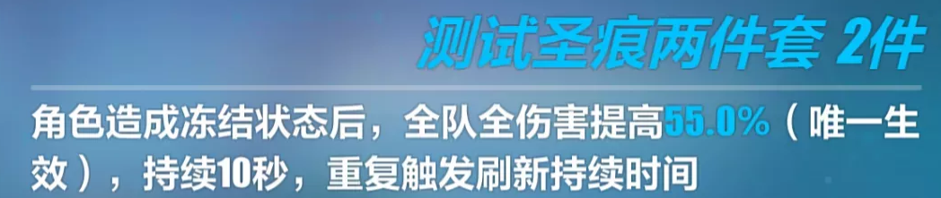 二件套能给队友大量全伤加成且持续时间非常长,对于经常冰冻目标的角色来说这个效果基本等于常驻。