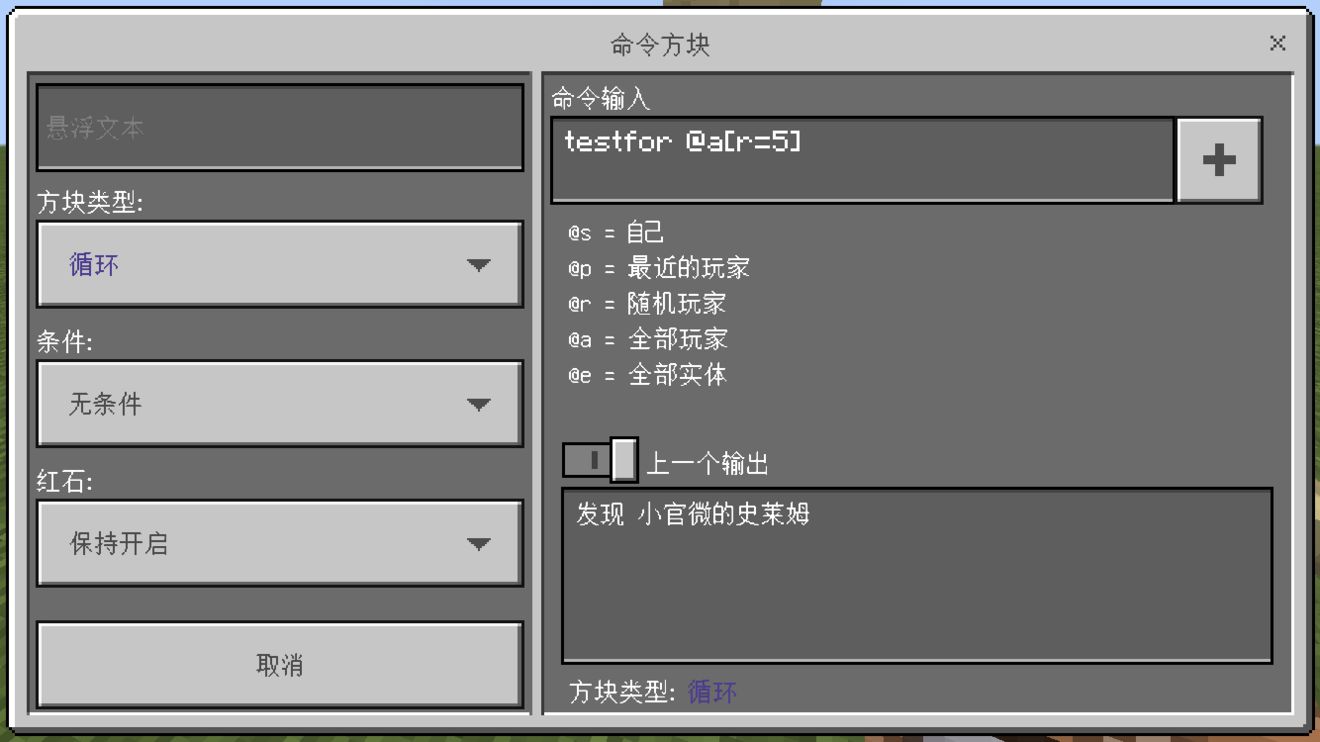 10、同时“红石”选项选上“保持开启”,在右边命令输入框输入testfor@a[r=5]