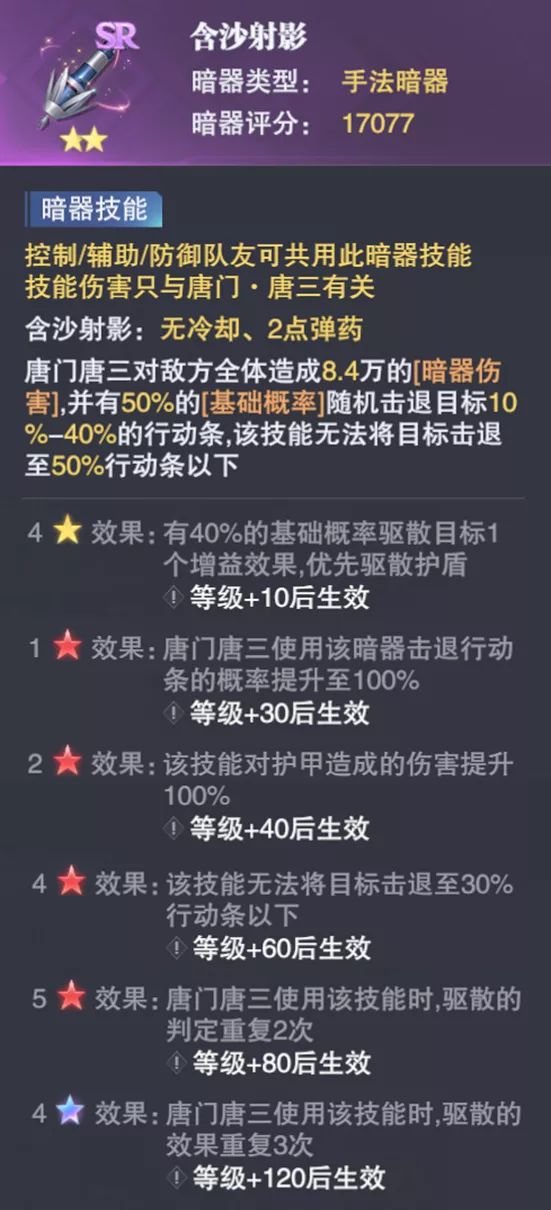 另外在攻击的同时暗三还有一定的几率会驱散目标的1个增益效果,且在后续的星级提升效果中该驱散的判定次数最高可以提高到3次。